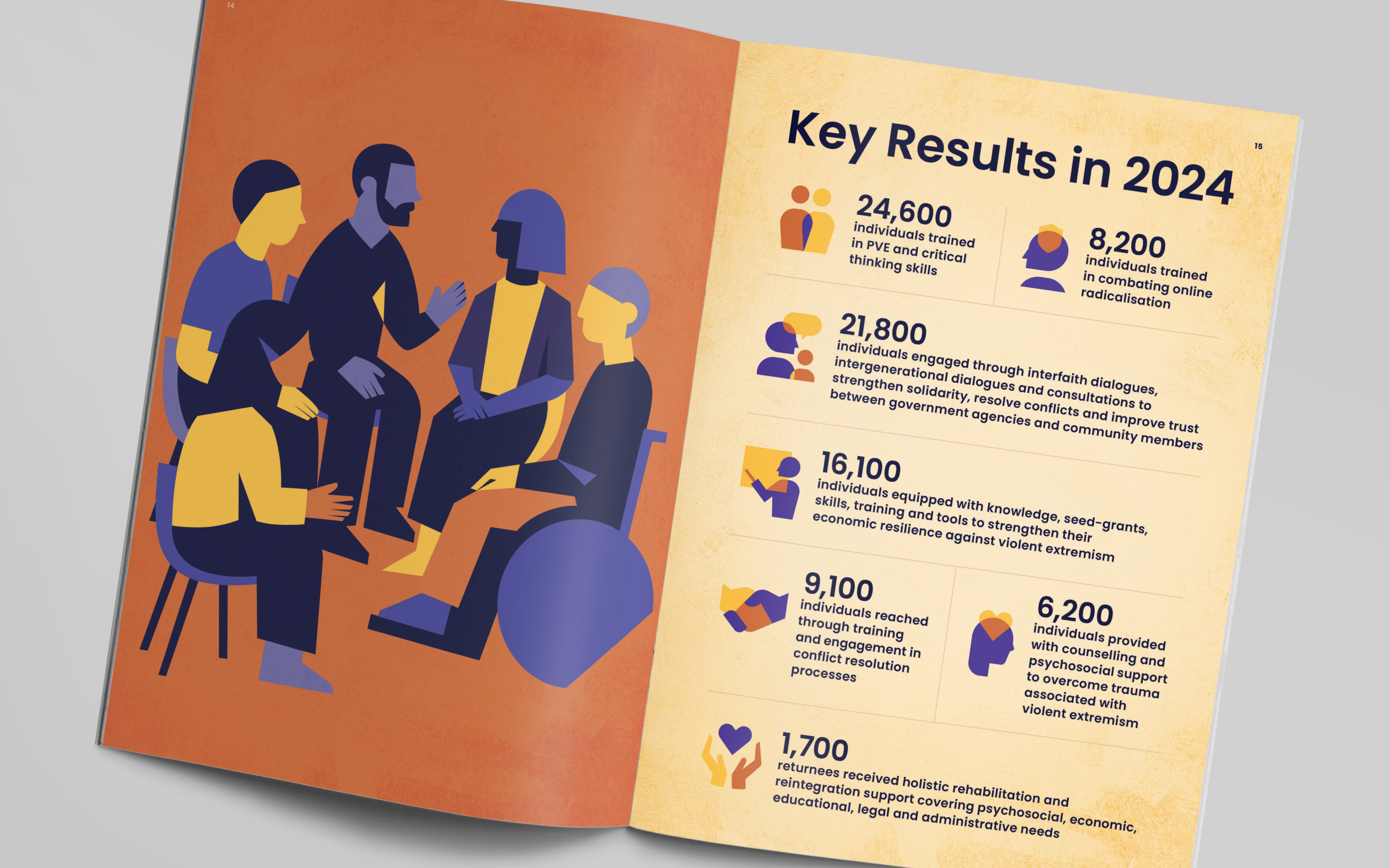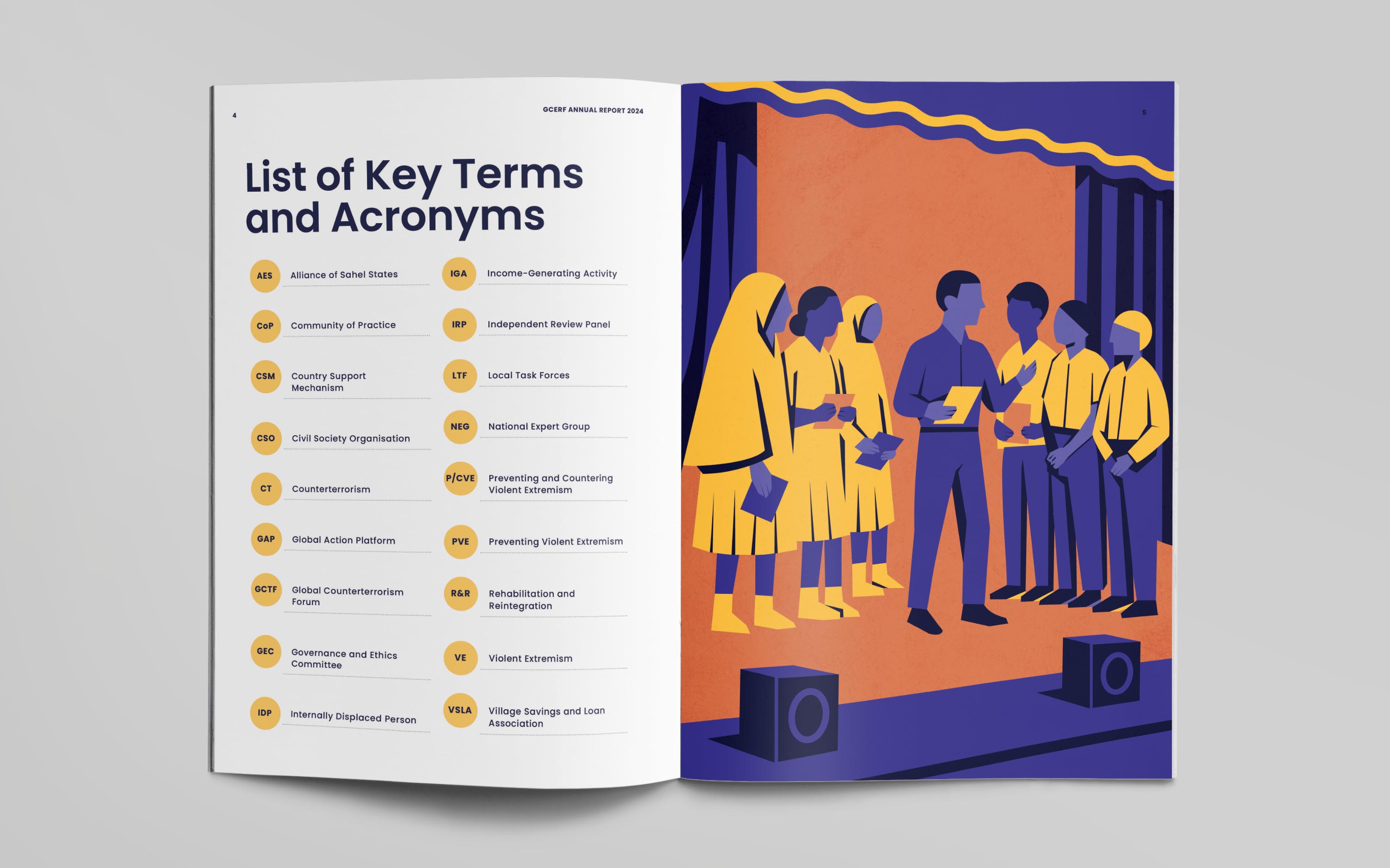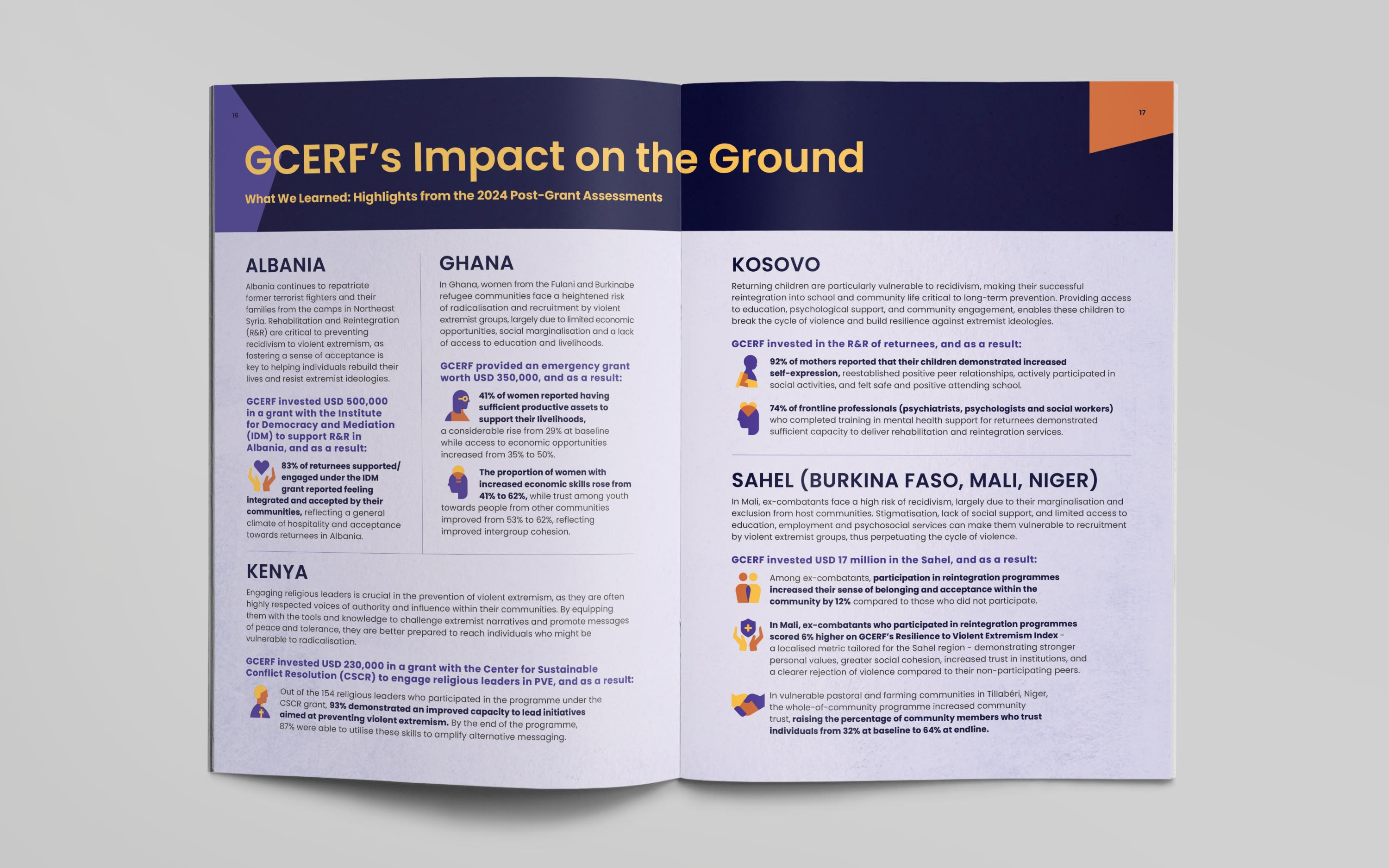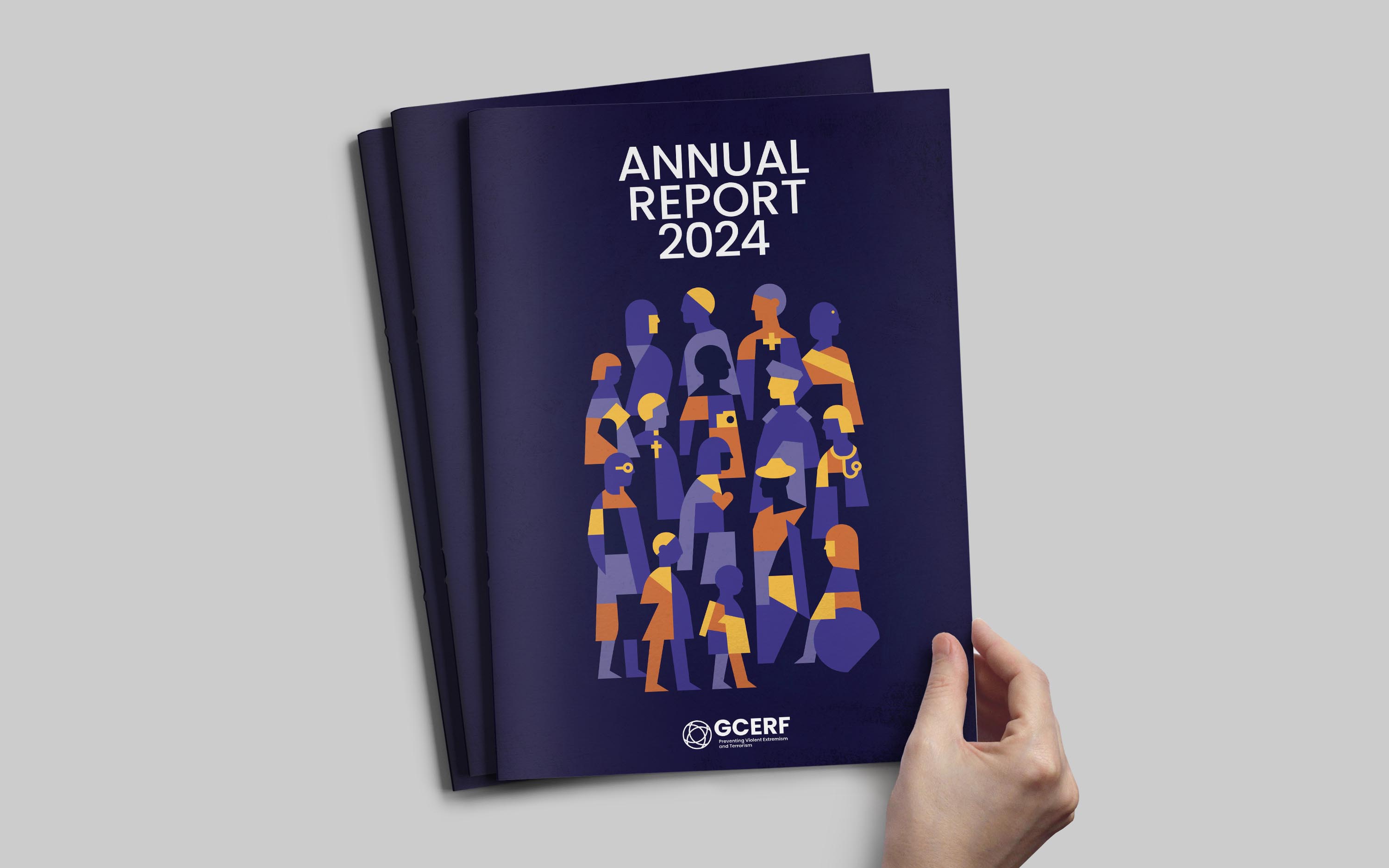 For the publication, we developed a bold editorial identity built around a mosaic-inspired visual language. The cover illustration brings together diverse people, roles, and communities into a unified composition, reflecting GCERF’s whole-of-society approach to preventing violent extremism. This concept was extended across the report, informing chapter openers, interior illustrations, and a custom icon set, creating a flexible visual system designed to be adapted for future communications and provide GCERF with a distinctive, cohesive identity.