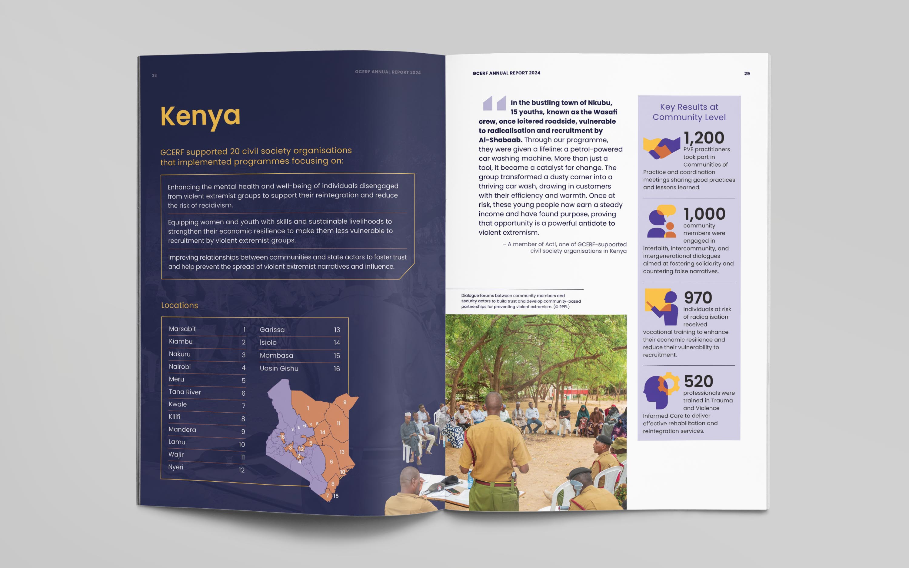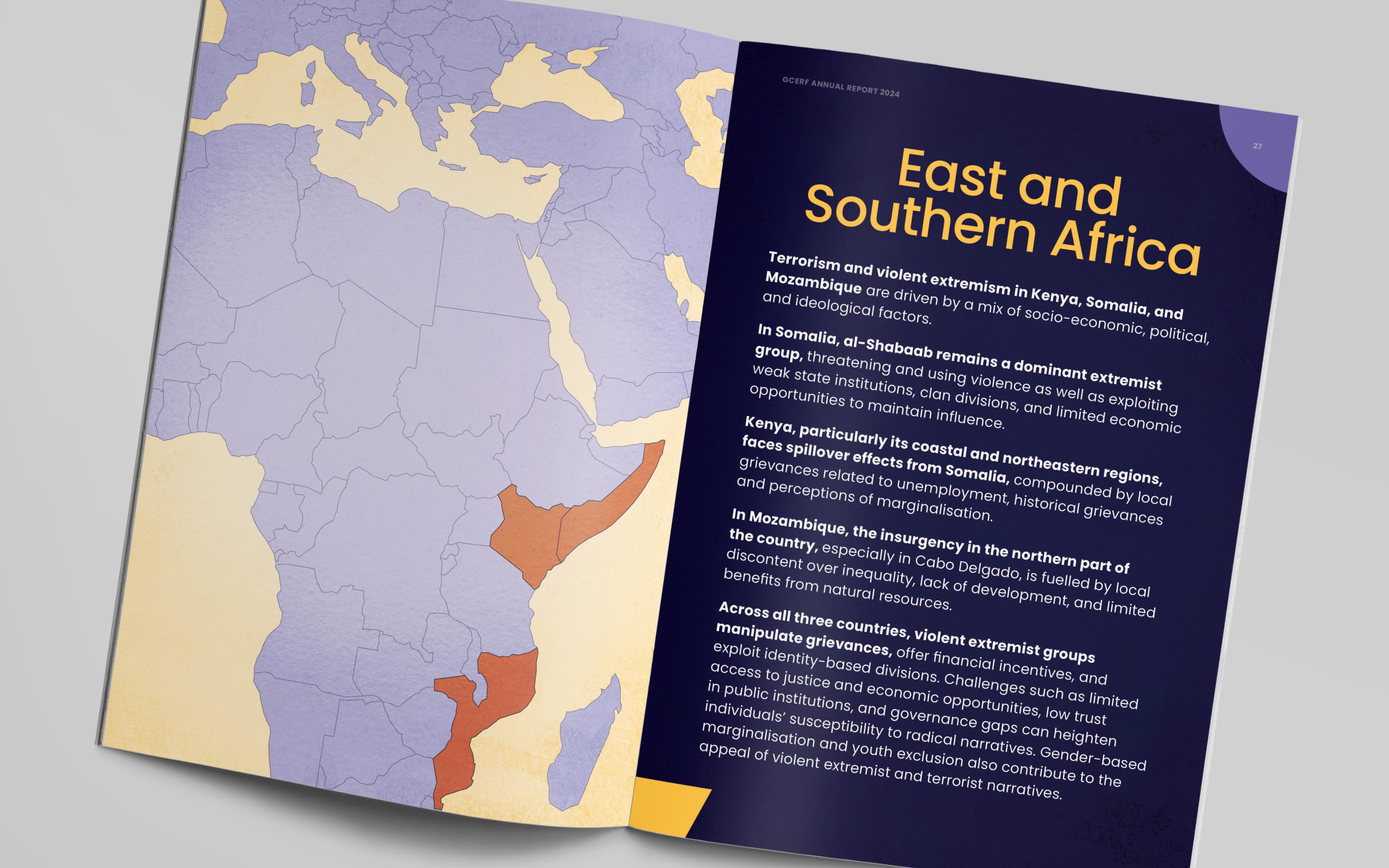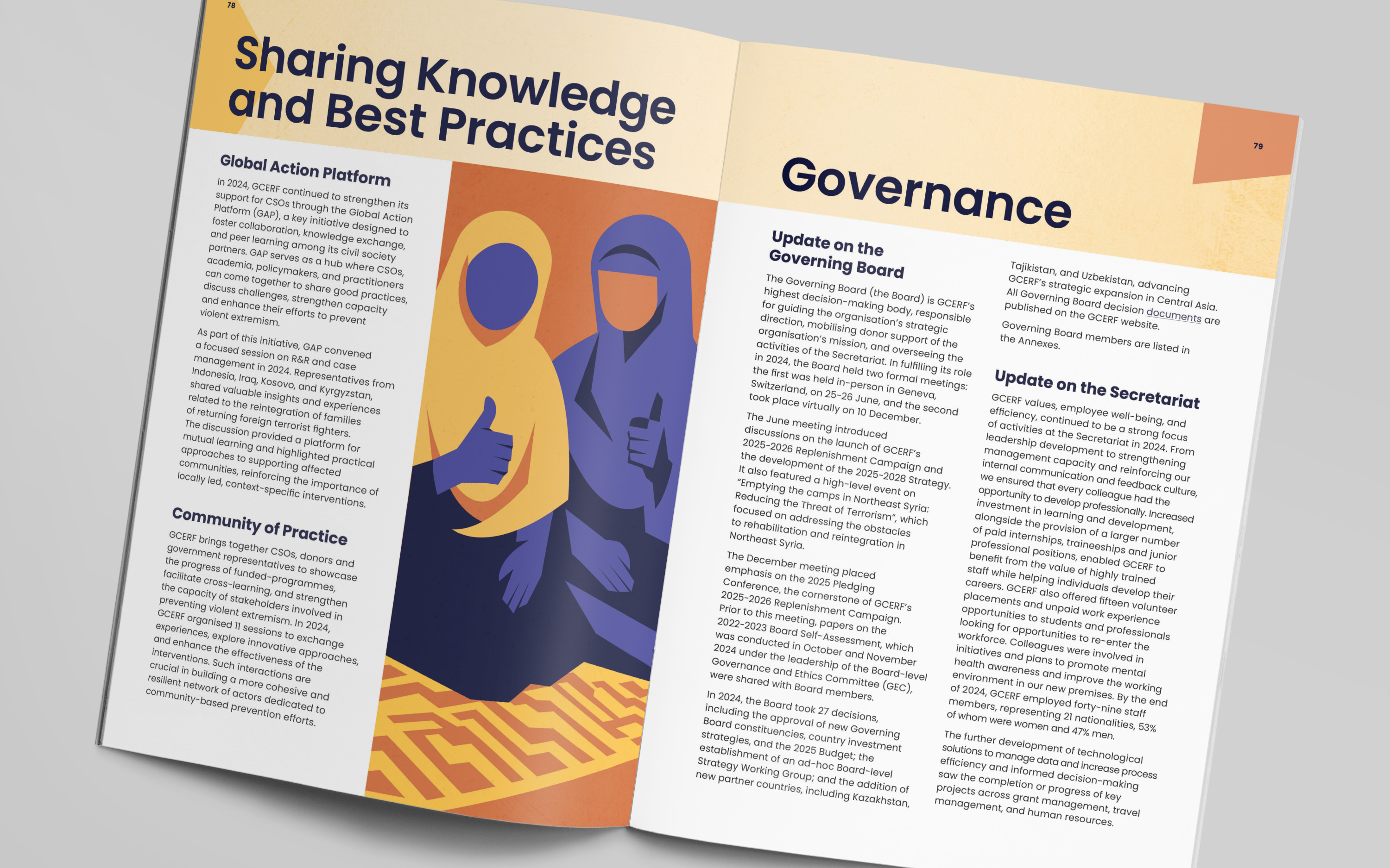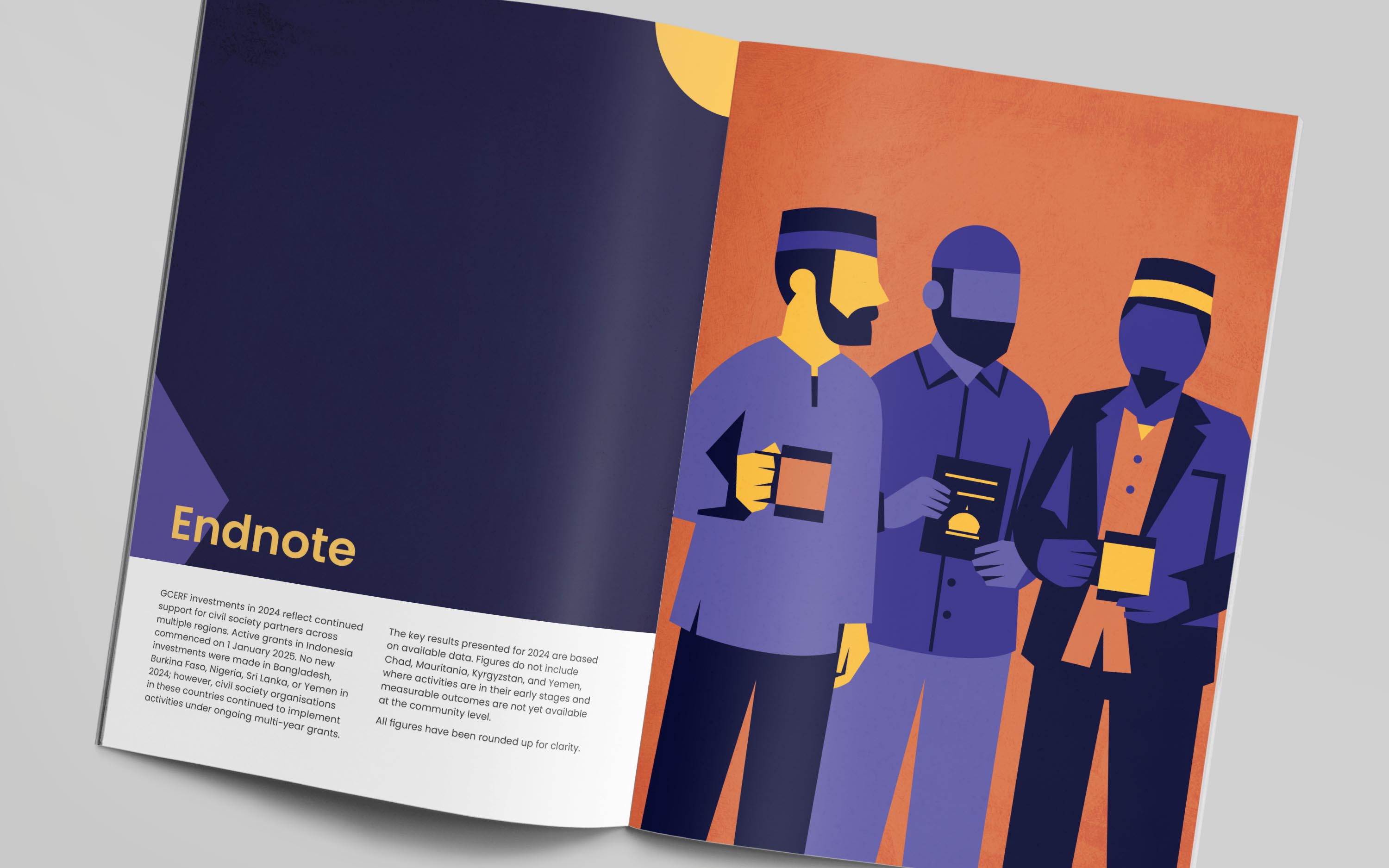 For the publication, we developed a bold editorial identity built around a mosaic-inspired visual language. The cover illustration brings together diverse people, roles, and communities into a unified composition, reflecting GCERF’s whole-of-society approach to preventing violent extremism. This concept was extended across the report, informing chapter openers, interior illustrations, and a custom icon set, creating a flexible visual system designed to be adapted for future communications and provide GCERF with a distinctive, cohesive identity.