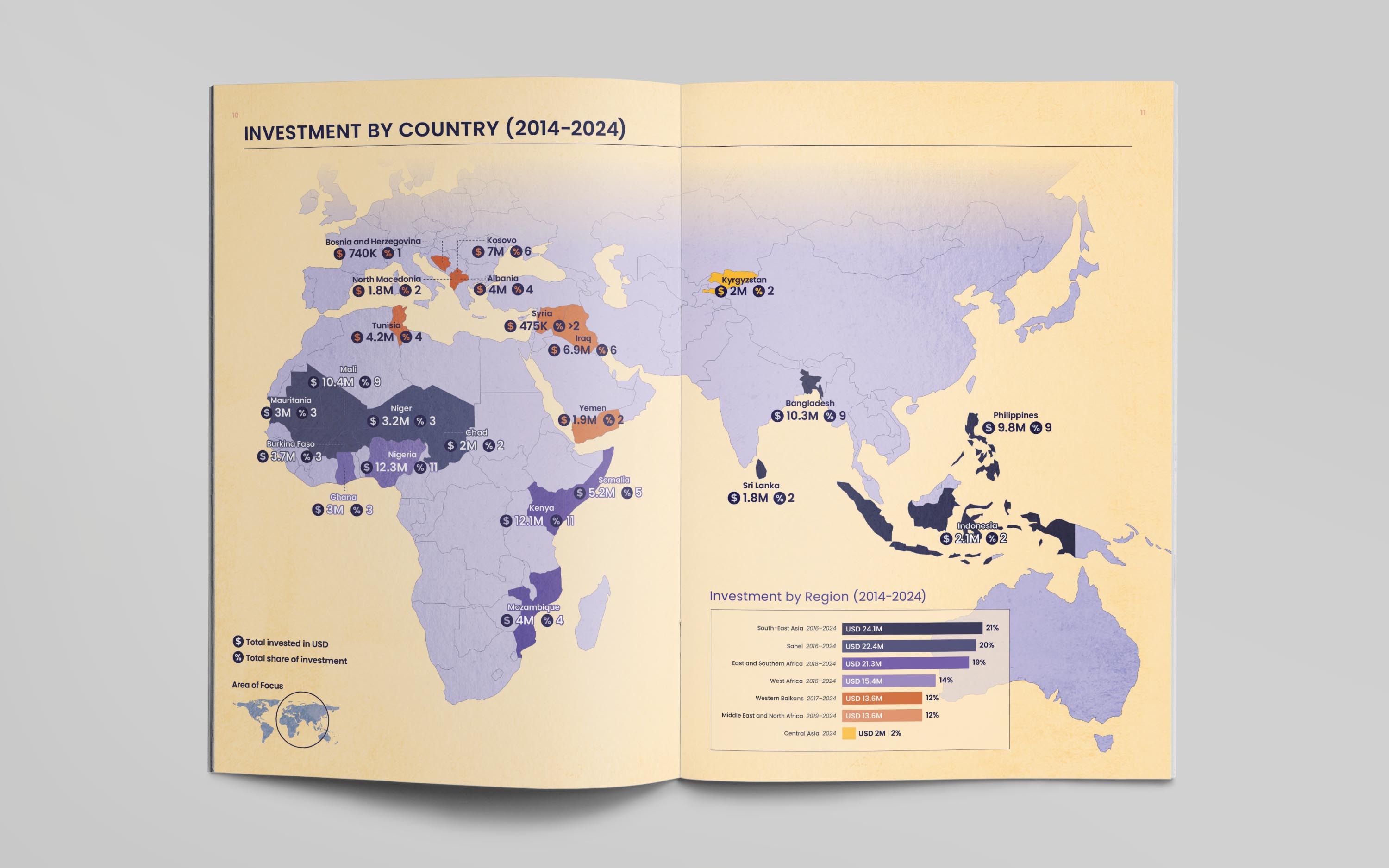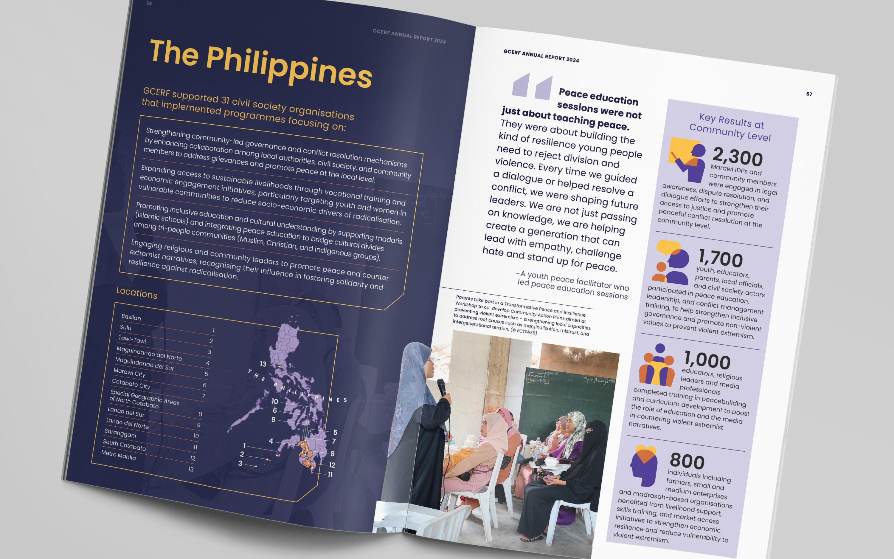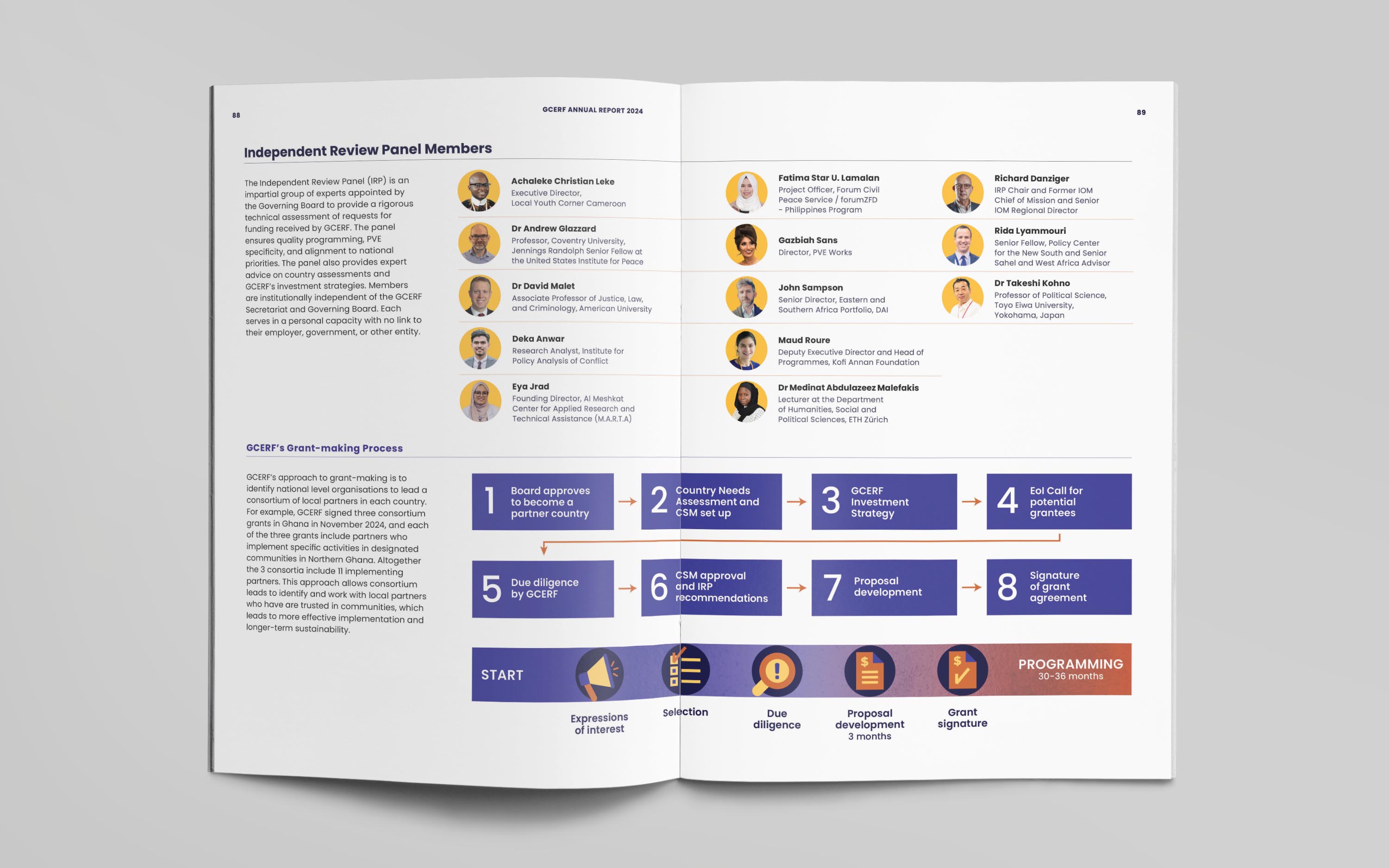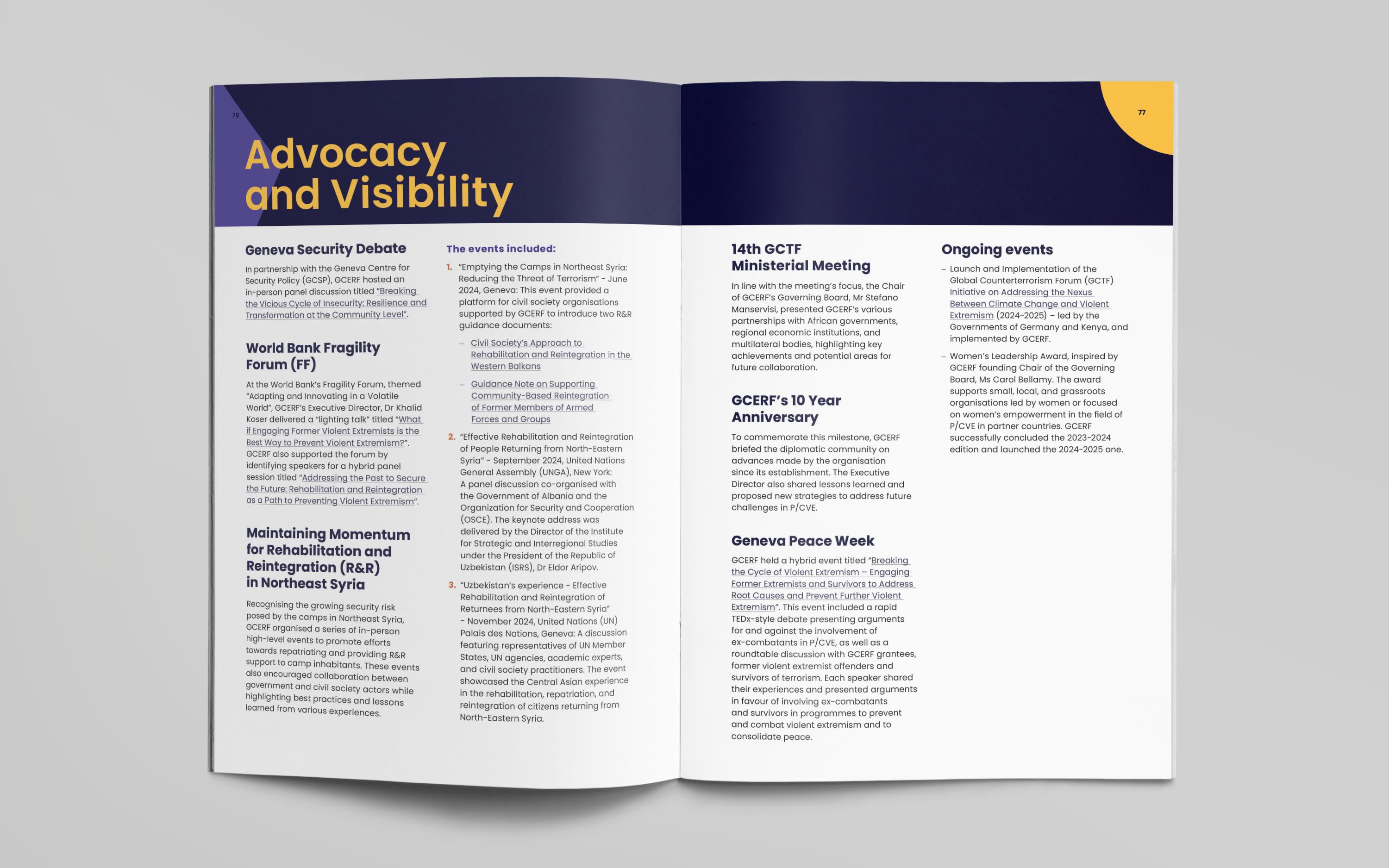 For the publication, we developed a bold editorial identity built around a mosaic-inspired visual language. The cover illustration brings together diverse people, roles, and communities into a unified composition, reflecting GCERF’s whole-of-society approach to preventing violent extremism. This concept was extended across the report, informing chapter openers, interior illustrations, and a custom icon set, creating a flexible visual system designed to be adapted for future communications and provide GCERF with a distinctive, cohesive identity.